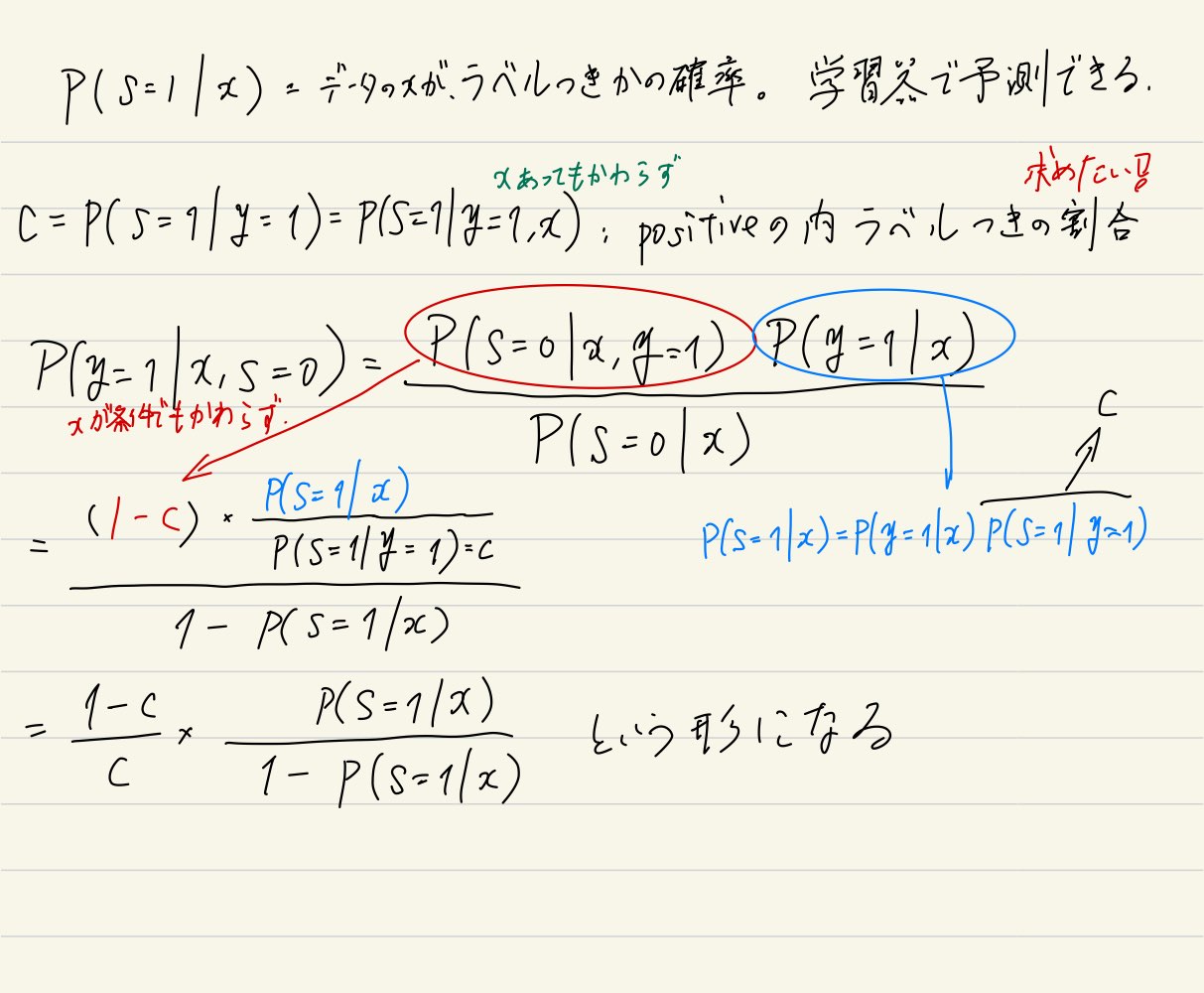 やりたいこととしては、$p(s = 1 | \mathbf{x})$を学習できたら、これをcalibrationして$p(y = 1 | \mathbf{x})$にすること。 というわけで、係数の**$c = p(s = 1 | y = 1)$を推定することができれば、勝ちです**。